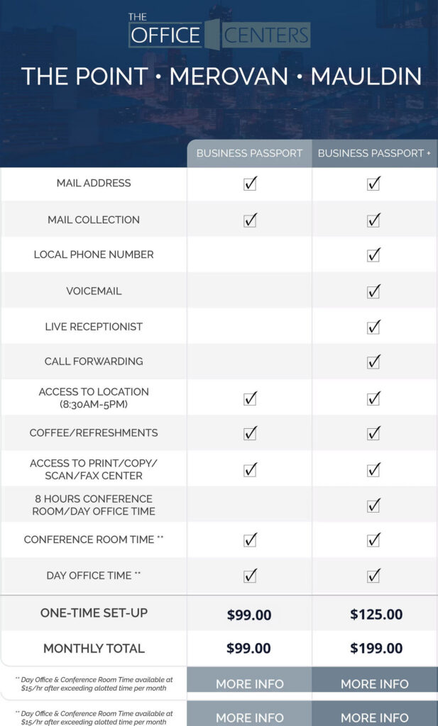 With our Virtual Office packages, The Office Centers gives you a prestigious business address at one of our three sought-after Greenville‑area locations—The Point, Mauldin, or Merovan—without the expense of a physical office. Enjoy access to conference and meeting rooms, professional phone answering—including greeting callers in your company name—and full use of our copy, scan, fax, and print center. It’s the perfect solution for entrepreneurs, remote workers, or satellite teams who need credibility, convenience, and flexibility—all backed by our local expertise and executive-level customer service